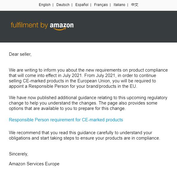 該新法規(guī)明確要求了歐盟境內(nèi)CE標(biāo)識(shí)商品的要求,目前有不少歐洲站的賣家都收到了亞馬遜的通知,主要內(nèi)容為: