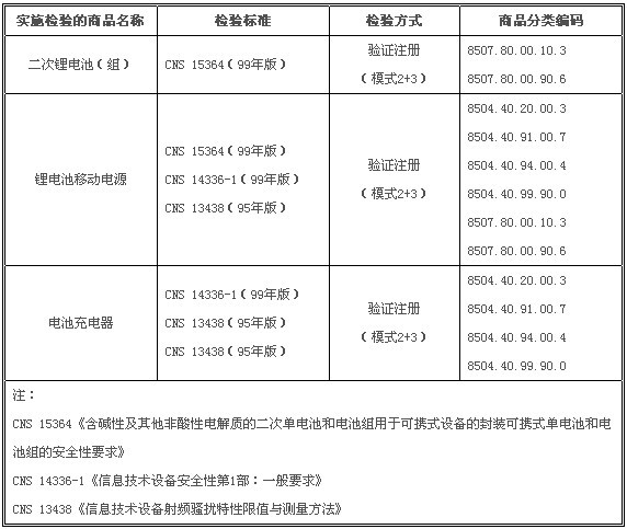 根據(jù)2013年7月26日的會議記錄,臺灣經(jīng)濟(jì)部標(biāo)準(zhǔn)檢驗局(BSMI)將計算機、通訊和消費電子三類產(chǎn)品(簡稱3C電子產(chǎn)品)中的二次鋰電池(組)、鋰電池移動電源和電池充電器納入其強制性商品檢驗范圍,新規(guī)定將從2014年3月1日開始實施。